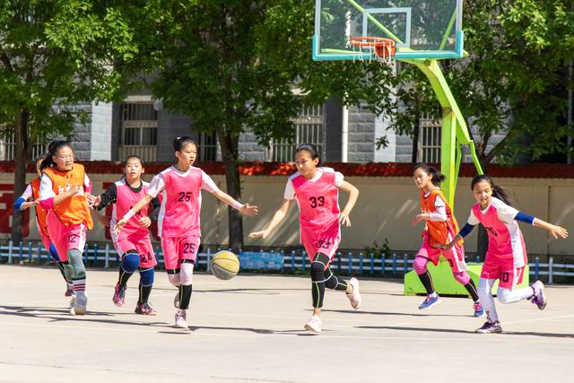 2021年5月20日,宁夏中宁县第九小学五年级篮球队女队员在体育课上打篮球。新华社发(黎广滔 摄)