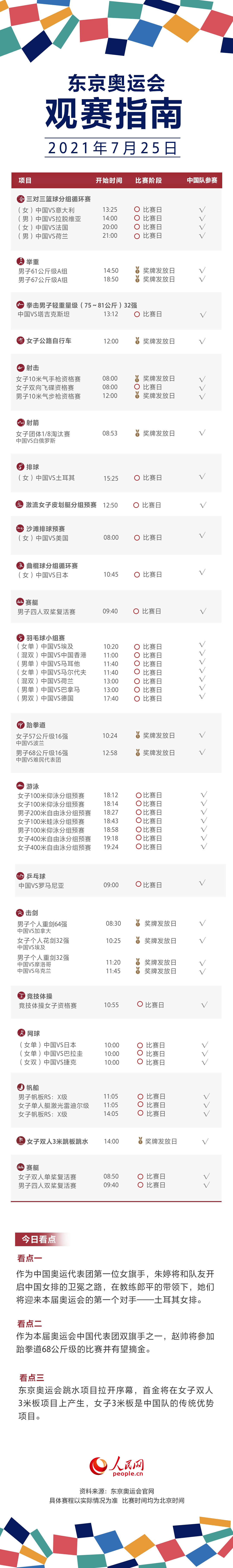人民网北京7月25日电 (记者杨虞波罗)今日,作为中国奥运代表团第一位女旗手,朱婷将和队友开启中国女排的卫冕之路,在教练郎平的带领下,她们将迎来本届奥运会第一个对手土耳其女排。另一位旗手赵帅将参加跆拳道68公斤级的比赛并有望摘金。另外,东京奥运会跳水项目拉开序幕,首金将在女子双人3米板项目上产生,女子3米板是中国队的传统优势项目。