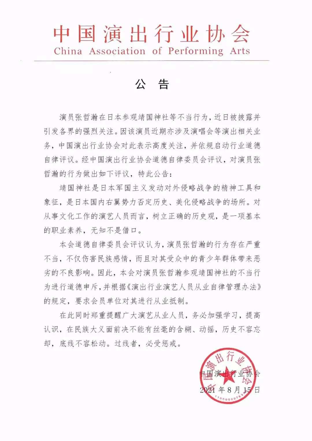 演员张哲瀚在日本参观靖国神社等不当行为,近日被披露并引发各界的强烈关注。因该演员近期亦涉及演唱会等演出相关业务,中国演出行业协会对此表示高度关注,并依规启动行业道德自律评议。经中国演出行业协会道德自律委员会评议,对演员张哲瀚的行为做出如下评议,特此公告: