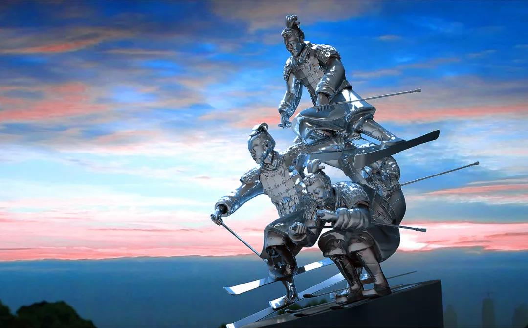 当兵马俑滑起雪来,会是什么样子的?这个问题的答案,可以在一件名为《今古寄情》的艺术雕塑上找到答案。据悉,作品的创作灵感源于北方民族“骑木而行”的滑雪习俗,运用古今穿越的艺术表现手法,以兵马俑作为主体,塑造了高山滑雪的速降动感形象。