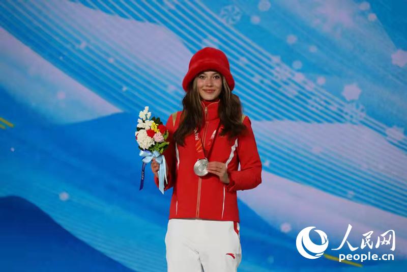 人民网张家口2月15日电 今晚,北京冬奥会自由式滑雪女子坡面障碍技巧颁奖仪式举行,中国选手谷爱凌获得银牌,这也是她在本届冬奥会上获得的第二枚奖牌。瑞士选手玛蒂尔德·格雷莫德获得金牌,爱沙尼亚选手凯莉·西尔达鲁获得铜牌。(人民网记者胡雪蓉摄影报道)