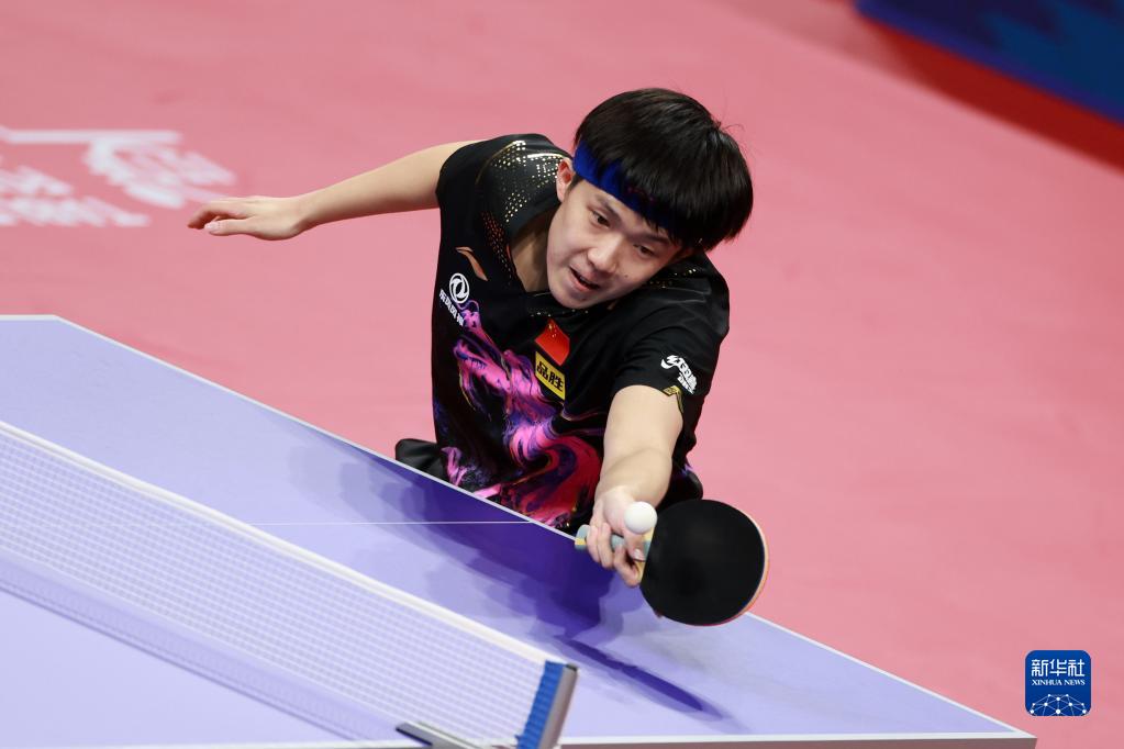 2022年10月9日,中国队选手王楚钦在比赛中回球,他以3:0战胜德国队选手凯·斯达姆珀。当日,在成都世乒赛男团决赛中,中国乒乓球男队3:0战胜德国队。 新华社记者胥冰洁摄