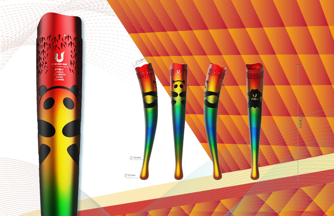 色彩方面,火炬运用多彩渐变的大运会主视觉色块,将朱红、明黄、翠绿、湖蓝四个渐变色整合起来,又呈现成都热情、活力、时尚的多彩生活与大学生的斑斓青春。